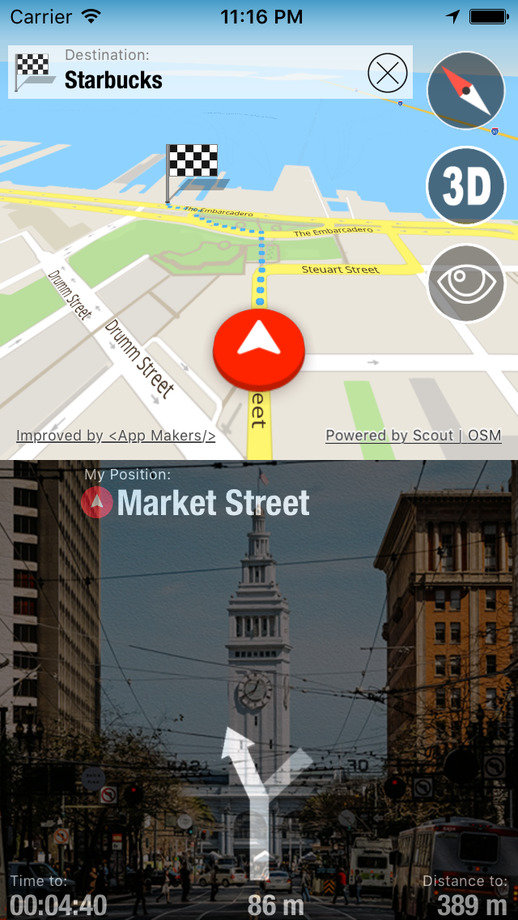 -行车路线不仅出现在屏幕上,它们覆盖在你所驾驶的真实街道的实时视频流。