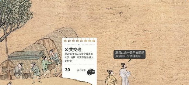 除了之前的文字版,支付宝微信公众号还发布了“清明上河图”2017年度账单版,十分独特,特点就是长长长......还是惟妙惟肖的动态图,其中还有马云和手机自拍、移动扫码支付等内容,免押金共享小黄马诙谐,特别是那句“小兔崽子,你想气死我好继承我的花呗吗?”展现了生动的“花呗分期”支付等场景。