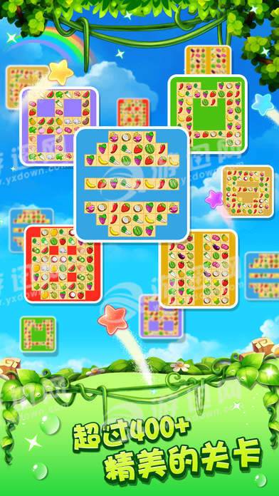 水果连连看最新版是一款非常有趣的休闲游戏,游戏色彩艳丽带给玩家舒心畅快的感觉,还有酷炫的闪电连击带给玩家爽到爆的刺激,有超过400+的游戏关卡让你的生活不会再无聊,赶快来挑战自己吧。