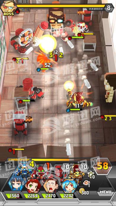 【技能激烈放送,华丽超绝合体】 《QUBOT像素战机》中除了单纯的碰撞伤害之外,当机甲停下时会有驾驶员专属技能进行攻击。随著每回合的经过机甲也可使用华丽的招式击败对手,最终BOSS战时只要我们累计足够的点数就可以发动[超绝合体]技能,组合四隻机甲发动超绝攻击。