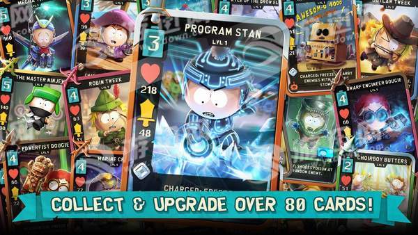 《南方公园:手机毁灭者》(SouthPark:PhoneDestroyer)是一款美国经典动画《南方公园》改编的卡牌对战手机游戏,蠢萌的画风,搞笑的对话,让人捧腹大笑。喜欢这4个逗比的小伙伴就来玩玩这款手游吧!