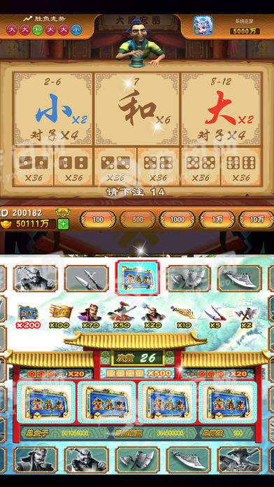 此游戏参照老虎水果机的模式,每轮中奖后都有摇骰子(色子)猜大小的游戏。