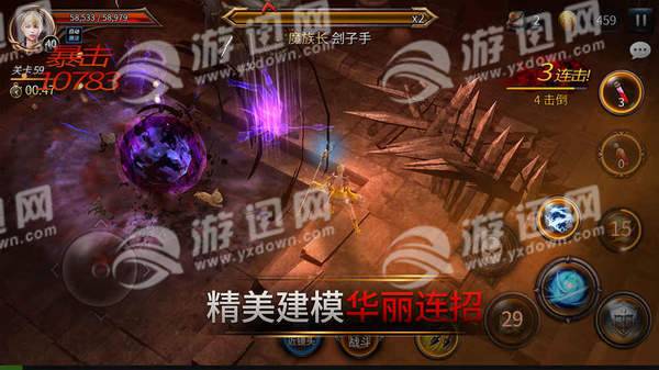 游戏共分为三大职业:战士、刺客、法师,玩家可以使用虚拟摇杆+技能按键的操作方式,还可以积攒能源发动超必杀技给敌人华丽的一击。另外,在进入绝招发动模式后,可以使用特殊攻击技击杀Boss。