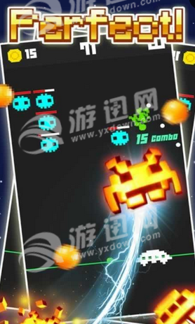 游戏的画面是复古的像素风格,玩家需要在游戏里发射子弹,来击打屏幕上方的目标,吃下各种各样的道具。
