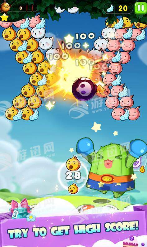 -抛出泡泡,3个相同花色连在一起就可消除和得分喔!