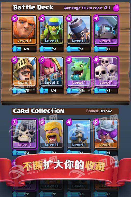 ●打造并升级您的卡牌收藏,包括《ClashRoyale》皇室成员和数十个来自于《部落冲突》的部队、法术和防御设施。
