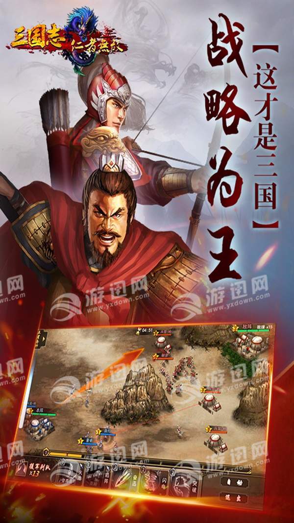 三国志仁者无敌是一款极具有策略性的三国手游,三国时代的著名将士和海量士兵任由你调遣,精美的画质,全新的引擎技术,打造真实的三国世界。