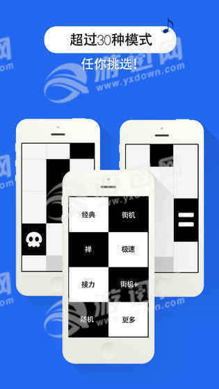 经典模式,以最快的速度到达终点。 街机模式,你有能力得多少分就得多少分,没有任何限制,这也是最具挑战性的一个模式。 限时模式,在30秒内看你能走几步。 极速模式,没有最高速限制的街机模式,挑战你的极限接力模式,规定时间内完成50块儿,然后会有更多时间去完成另外的50块儿。