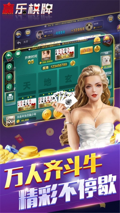 最火爆的棋牌游戏《赢乐斗牛》是一款多玩法汇集一身,简单刺激的棋牌游戏。精致优雅的界面让您流连忘返。游戏玩法多样,节奏轻快,紧张刺激。加入万人牛牛模式,更富有挑战,每个场次红包任意领,看准下注,买定离手,轻松一夜暴富的扑克牌游戏,快快加入吧!