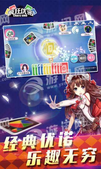 疯狂优诺是一款非常好玩的美少女+牌类游戏。优诺即UNO,是一款非常有意思的卡牌游戏。玩家可以通过疯狂优诺与小伙伴们线上联机,更有可爱的虚拟偶像小姐姐陪你一起玩耍!