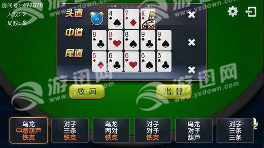每位玩家需将手上的13张牌分成头、中、尾三墩牌,头墩三张,中尾墩各五张。