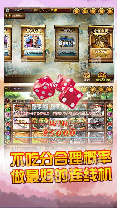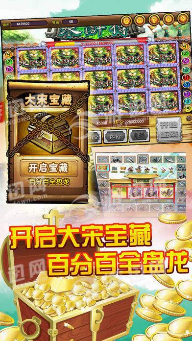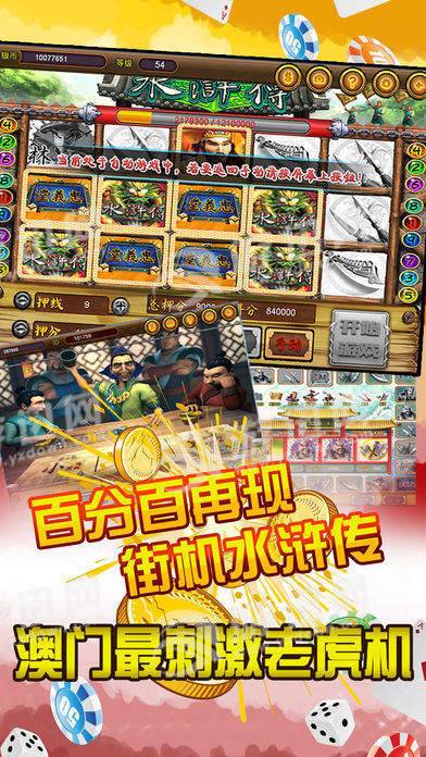 真街机,神还原!每轮中奖后有类似骰子梭哈的比大小游戏。达到条件能触发“小玛丽”送奖环节,国内首款由中国风、水浒传元素和连线机完美结合的街机类手机游戏!