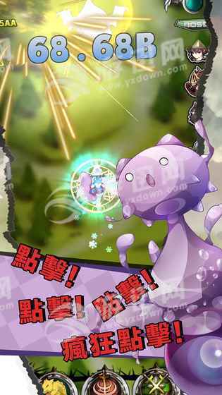 是利用指尖疯狂连续点击画面的游戏!消灭挑战每一波的敌人,冒险途中各式各样的伙伴宠物的加入,收集过关金币,组合强化各种装备,提升实力,与世界好友们一同併肩作战。