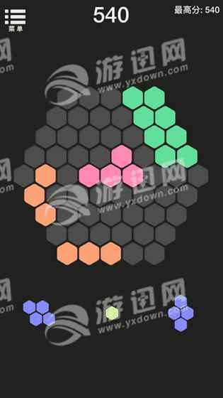 六角碎片是一款十分考验玩家脑力的趣味休闲益智游戏,简约的游戏界面,玩家需要从下面的图形中选择一个拖进蜂窝里,一个方向的格子填满后就会消除。看看谁的分数最多!