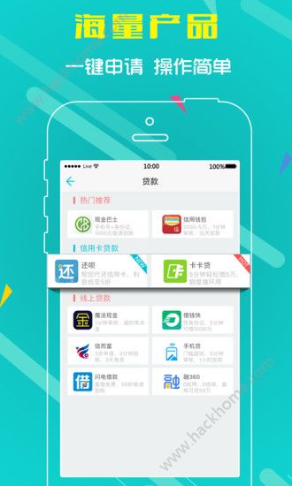 3.纯线上的手机贷款平台,拥有海量贷款产品任君挑选:手机贷、卡卡贷、融360、飞贷、宜人贷、现金白卡、拍拍贷、你我贷、平安普惠、i贷等;