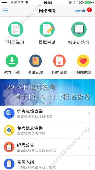 2、包括模拟考试、科目练习、知识点练习、试卷下载、试题收藏、考试记录、统考成绩查询、免考信息查询、统考公告、考试大纲等功能。