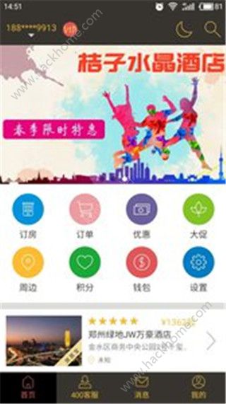 4、旅居宝APP主要包括三大部分:首页、400客服、消息和我的。首页包含国内合作体系酒店的分类检索、订房、订单、优惠、大促、周边线路、积分、钱包和设置等功能!