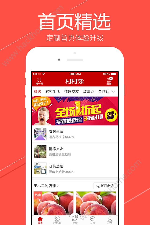1、首页:人工筛选精致信息,包含文章、供需、村庄等多种形式,展开还可发现更多频道快捷入口;
