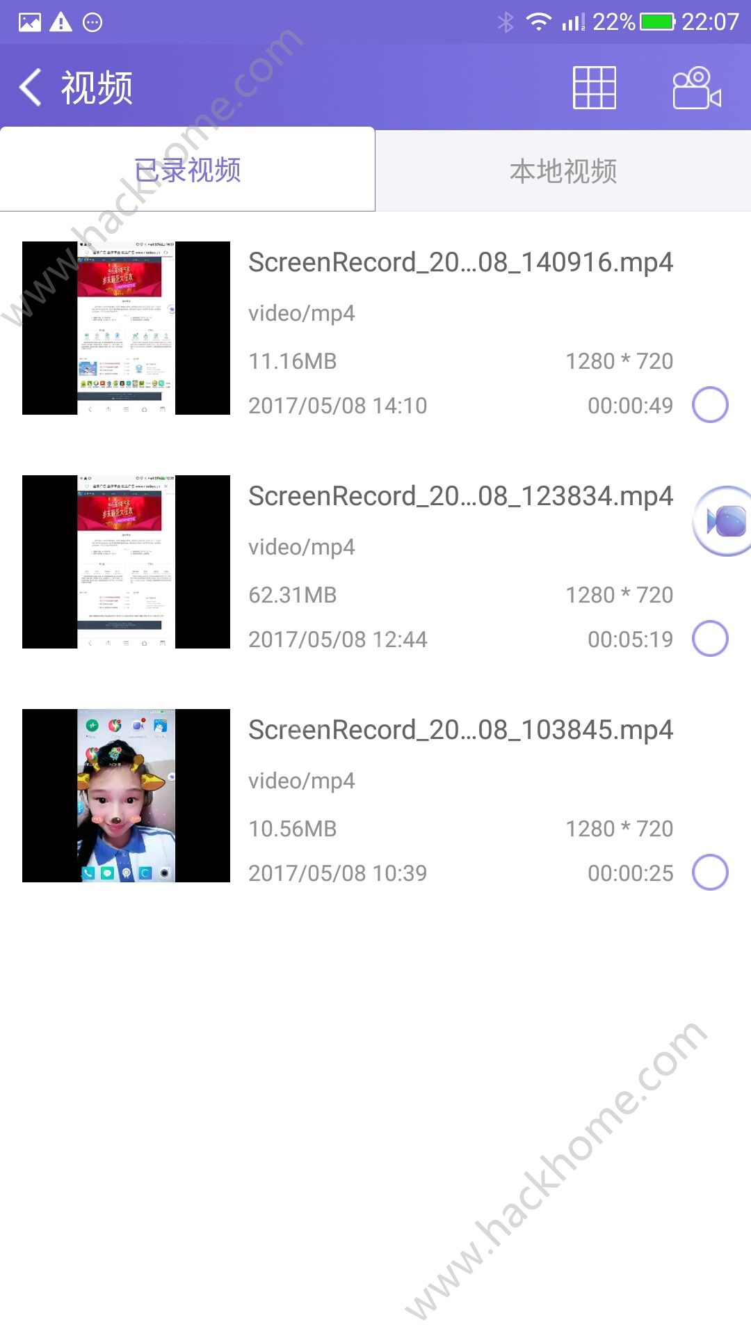 1、支持移动端高清视频录制,除了手机屏幕,您还可以录制麦克风声音,并通过暂停、恢复按键控制整个录屏进程,不管是游戏、视频聊天还是教学演示、个人秀,您都可以轻轻松松在手机上一键搞定,视频录好后,您可以在列表中直接观看、重命名、删除或分享至手机上其他应用中。