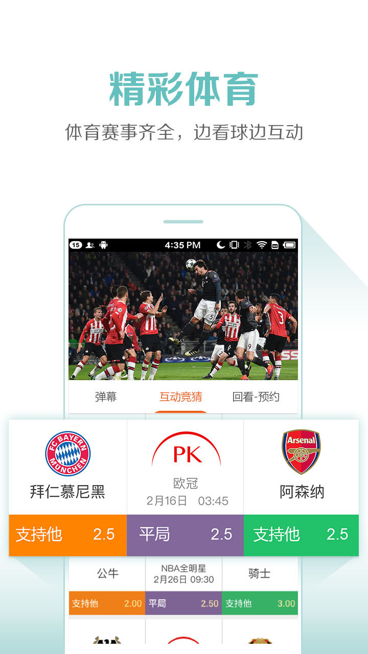 2、体育频道种类齐全,包括cctv5、广东体育、北京体育、风云足球等直播热门体育频道,并附有赛程表。另提供中超、英超、西甲、意甲、德甲、法甲、CBA、NBA、亚冠、欧冠直播,更涵盖网球、摔跤、羽毛球、拳击、垂钓等体育项目。
