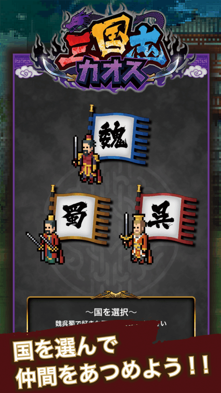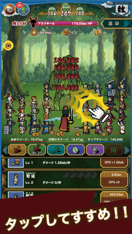 お気に入りの三国志キャラで邪悪なモンスターをやっつけよう!最大ダメージは1000000000000000000000000???超え!?タップ系RPG×三国志の世界へようこそ!◎タップだけの簡単操作!画面をとにかくタップしてモンスターを倒そう、仲間は自動攻撃してくれるよ!◎ドット絵で再現された仲間は全部で90体!!「魏」「呉」「蜀」でそれぞれ30体ずつ、キャラクター1体1体に個性を出してます!◎どこまでも続くステージ主人公や仲間をレベルアップさせて、誰もみたことのないステージを目指そう!【素材提供】キャラクター?背景:ドット絵製作所様モンスター:【Rド】様神器:Denzi様(http://www3.wind.ne.jp/DENZI/diary/)バグ修正