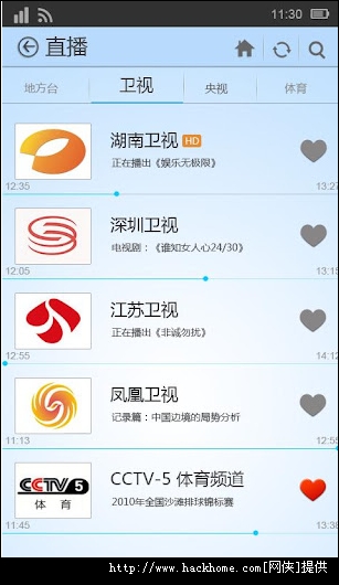 国内近百个电视台的免费手机直播,如:CCTV,湖南卫视、江苏卫视、东方卫视和地方台频道。另外还有CCTV-5,广东体育以及腾讯体育等体育频道。