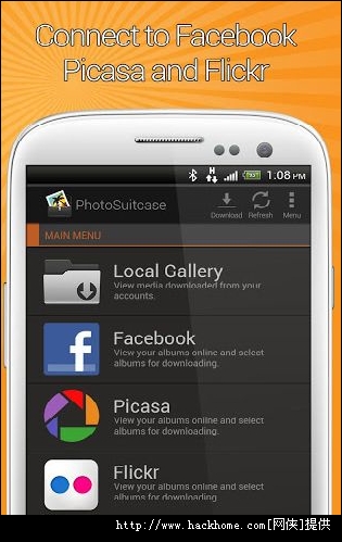 PhotoSuitcase云同步相册是一款相册云同步软件,可以将你在Flickr、Facebook和Picasa等社交网站上的照片下载保存到你的手机上,同时还可以设置自动同步,让你可以保证手机上的照片库和这些几大网站上的都保持一致。