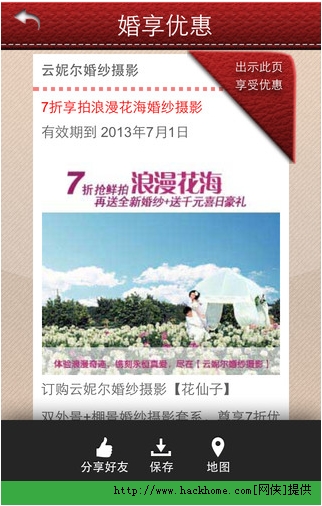 婚享优惠是一个为特殊人群开发的手机应用,为筹备婚礼中的男女解决头痛的杀价,对比,筹备问题。使婚礼的计划时间和使用的资金大大减少,已成为各热恋中情侣必不可少的一利器了。目前已在多家安卓应用市场和Appstore上能找到这个应用了,有兴趣的朋友快搜索婚享优惠吧!