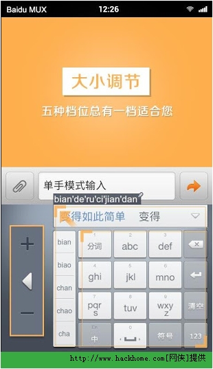 1.单手模式:根据左右手输入习惯,可调整键盘位置偏左或偏右,并可调节键盘大小,更加贴合手指移动范围.