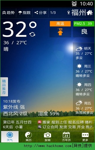 黄历天气apk是一款是国内首款完美结合天气与黄历功能的免费查天气软件,界面精美、预警贴心提醒,支持实时播报中国主要城市的空气污染指数,提供美使馆与环保部的PM2.5权威监测数据。是众多电子市场推荐的装机必备软件。