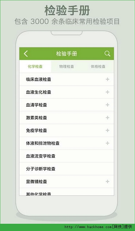 3.检验手册:1200余项临床常用检验项目的中英文名称、参考值范围、临床意义、相关疾病、样本采集和留取方法等