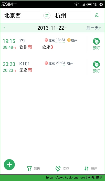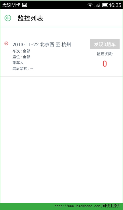 监控功能是在当前无票的情况下,对相应条件(起点/终点站、车次、时间、席位)提前设置再进行监控,等有票放出时,就能极时提醒,快速完成预定或查看可选结果。