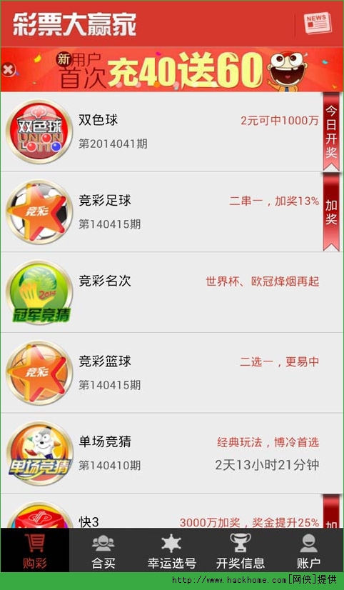 3.多种可选:双色球、大乐透、新老11选5、幸运赛车、竞彩足球、快三等十多种彩种任你玩;