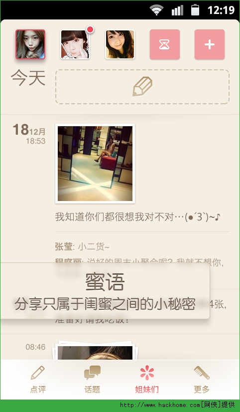 2.闺蜜圈,闺蜜姐妹必备,最多5个闺蜜之间的私密图片文字心情空间