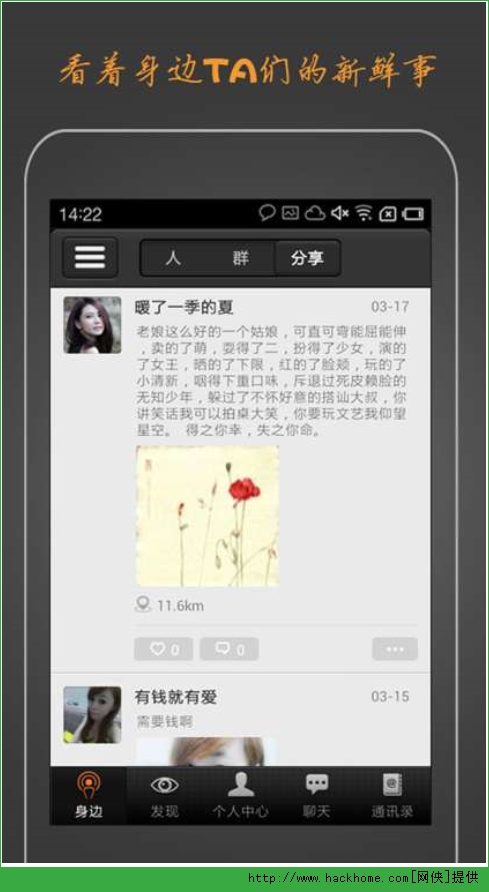 在身边安卓版:是一款手机交友软件,除了免费发消息,位置群聊天,发现附近分享内容等功能外,支持热门分享、聊天、关注动态,马上试试“在身边”,搜索附近的朋友,感受真实的精彩吧,网侠小编觉得很好用哟~