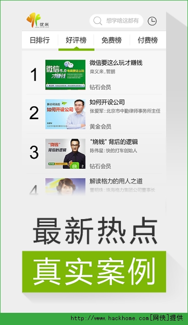 优米课堂手机安卓版apk是一款在线听课软件,好多知名人士的经验分享。优米课堂,比杂志更快捷,比听说更靠谱,比报表更生动。提升工作能力,听马云唠嗑,看史玉柱忽悠。小米模式、联想传奇。云集创业新锐案例。各路名人亲自授课,行业专家答疑解惑。优米课堂,年轻、梦想一代的选择。
