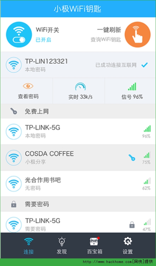 小极wifi钥匙安卓版:是一款wifi连接应用软件。帮您智能推荐附近的wifi公共热点,数千万公共免费热点WiFi库随时更新为您提供~还可查看wifi密码,分享给您的小伙伴们。