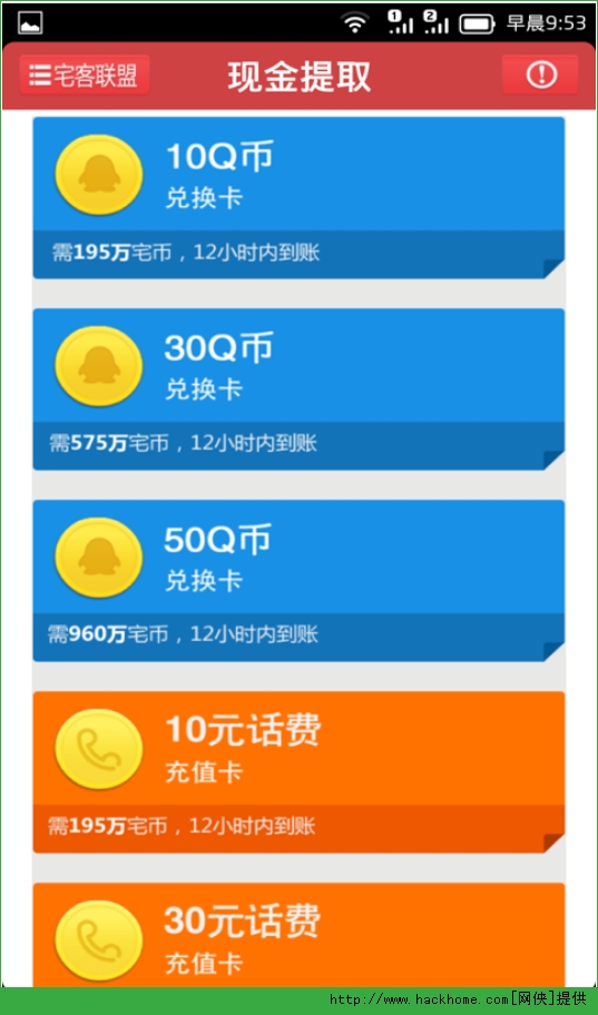 宅客联盟除了可以兑换Q币,我们还同时支持移动联通电信话费,免费QQ会员、支付宝财付通充值、cmccwifi免费上网卡,还可以兑换充电宝、u盘、日历、壁纸、360wifi等实物奖品。