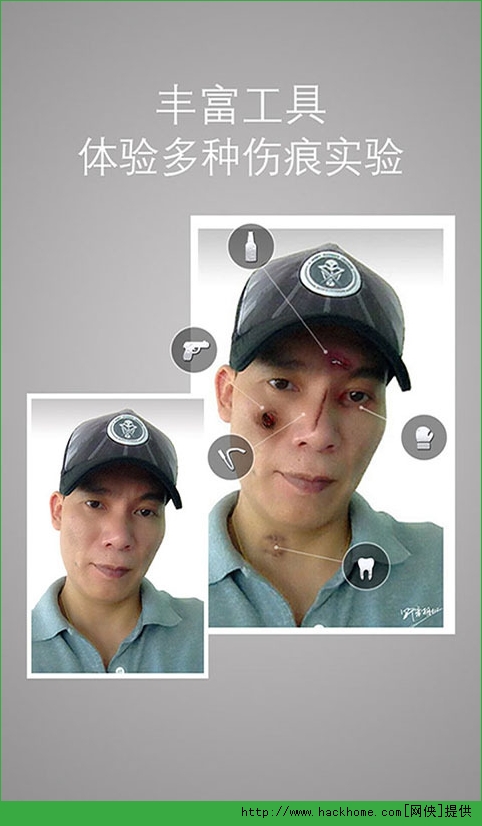 选取菜单内的打击工具及力度,点触图像,随即就会在图像上显示对应“伤痕”,及产生打击音效。随即可通过触屏方式对“伤痕”进行旋转、缩放等功能,取得真实得意想不到的伤痕效果!