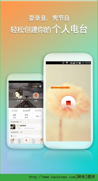 6.做主播:你可以上传你发现的好声音,也可以录制上传自己的声音,一键分享到微信、微博、人人、QQ空间,让你的好友跟你一起分享精彩!