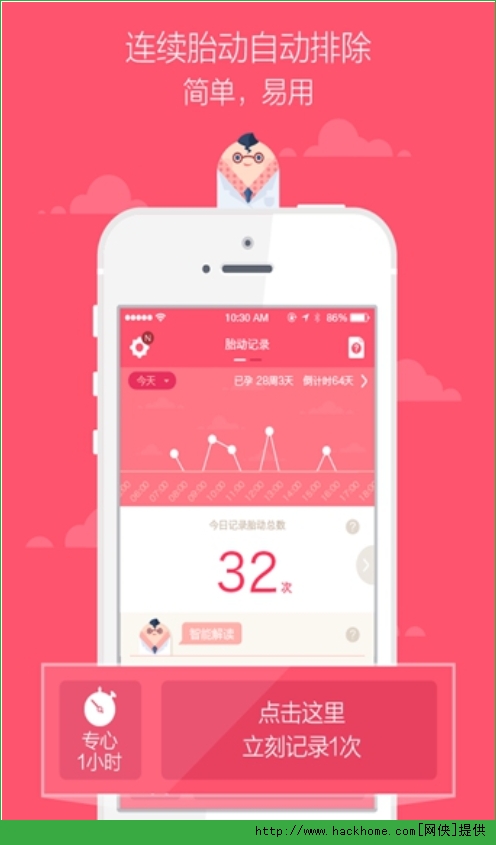 1、随时记录:可以“专心1小时”记录胎动,也可以不固定1小时,随心记录。宝宝动一下,点一下,方便高效;