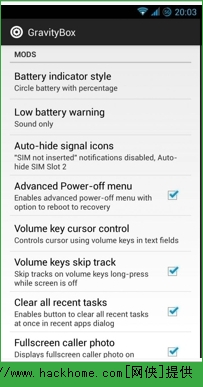 GravityBox是一款手机应用的重力工具箱。它依赖Xposed框架支持的全能系统工具,可以修复MTK6589的一些bug,通知支持修改rom参数。现在流行的ROM中有很多对界面改造的部分,而使用GravityBox就能够实现其中的大多数功能,可以做一些简单的DIY美化和手机界面设置。