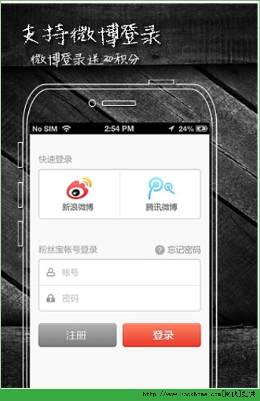 1、登录与注册:支持微博快速登录,微博登录送200积分;同时支持邮箱注册;