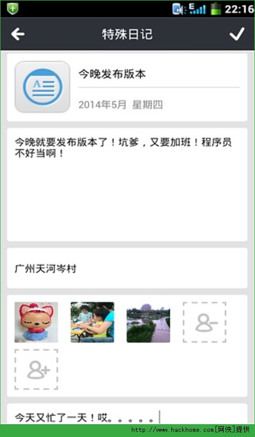 2、每种类型都有自己独有的特点。普通记事偏重于简单、便捷。而重要记事则提供,图标、地址、语音、图片等全方位的展现日志形式;