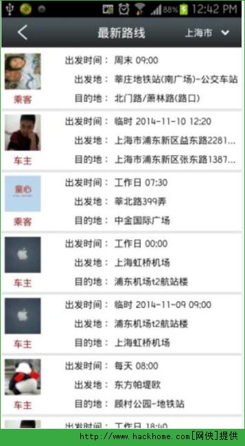 1、发布出行路线,系统智能匹配,微信、短信消息实时提醒。