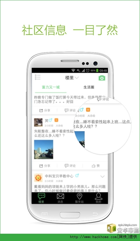 楼里安卓手机版app:这是一款以楼盘为单位的社区社交应用。这款app是以中高档楼盘业主为目标用户,提供信息分享、邻里沟通和生活服务。让您能随时随地分享社区新鲜事,一目了然公共互助、闲置物品转让和商户优惠,和邻居增进感情!