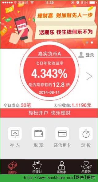 1.活期乐:支持多货币基金交易。嘉实活期宝,嘉实货币A,活钱包和薪金宝都可以随心存入或取出,快至1秒到账(因不可抗力、系统升级、维护或管理人另有公告的除外)。