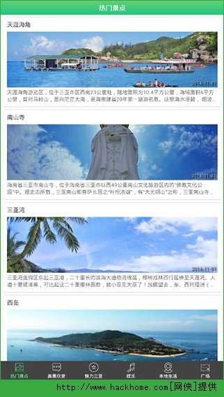 1.魅力三亚为您提供了最新的三亚生活信息和详情,其中包括魅力三亚、旅游景点、餐饮美食、酒店住宿、购物中心、休闲娱乐、三亚房产、特产推荐等,功能齐全。