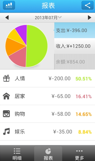 3.报表功能:包括当月各类型账目占比的饼状图和当月收入和支出对比的柱状图