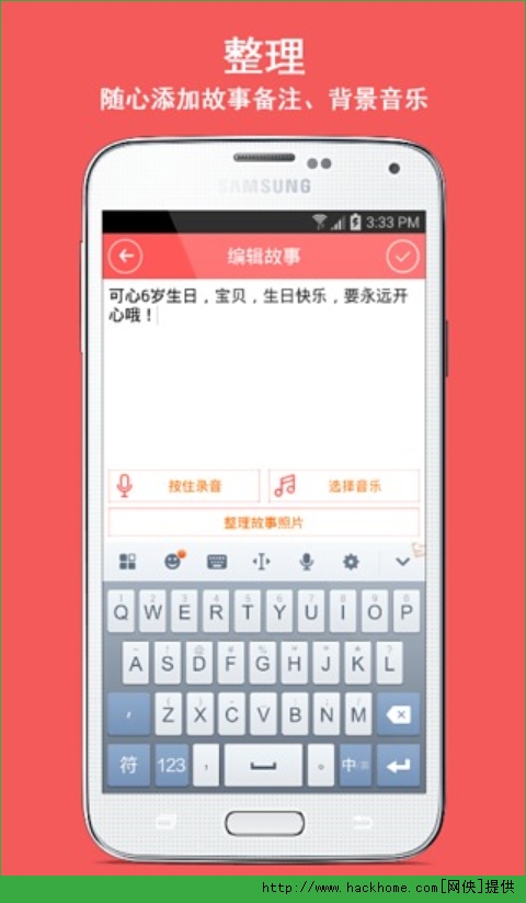 4、记录宝宝成长不再费时费力,整理随心添加故事备注(语音,文字)、背景音乐,调整照片顺序,重新分组照片;